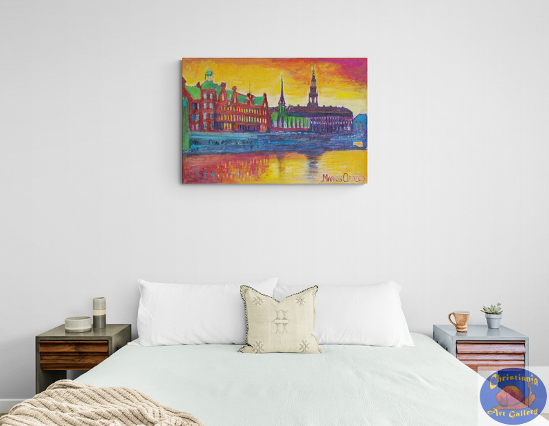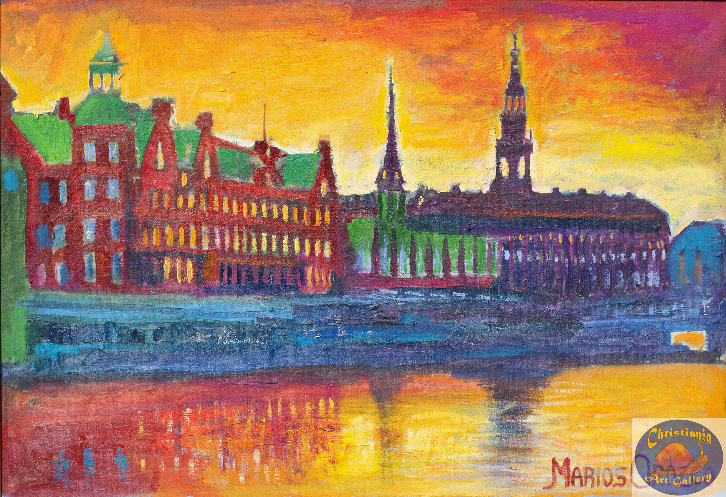 Marios loves to paint the old buildings in Copenhagen. Because of their beautiful and complex architecture with decorated facades, rooftops and spiral towers they are very inspiring for Marios.