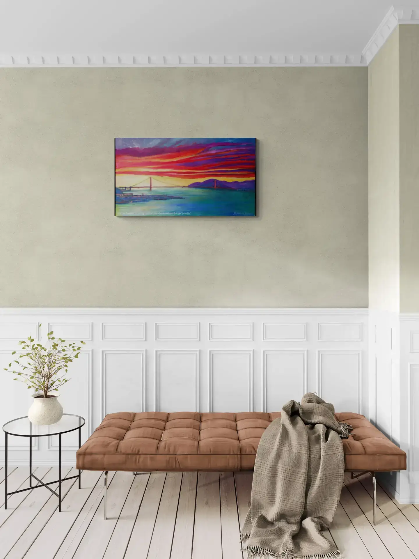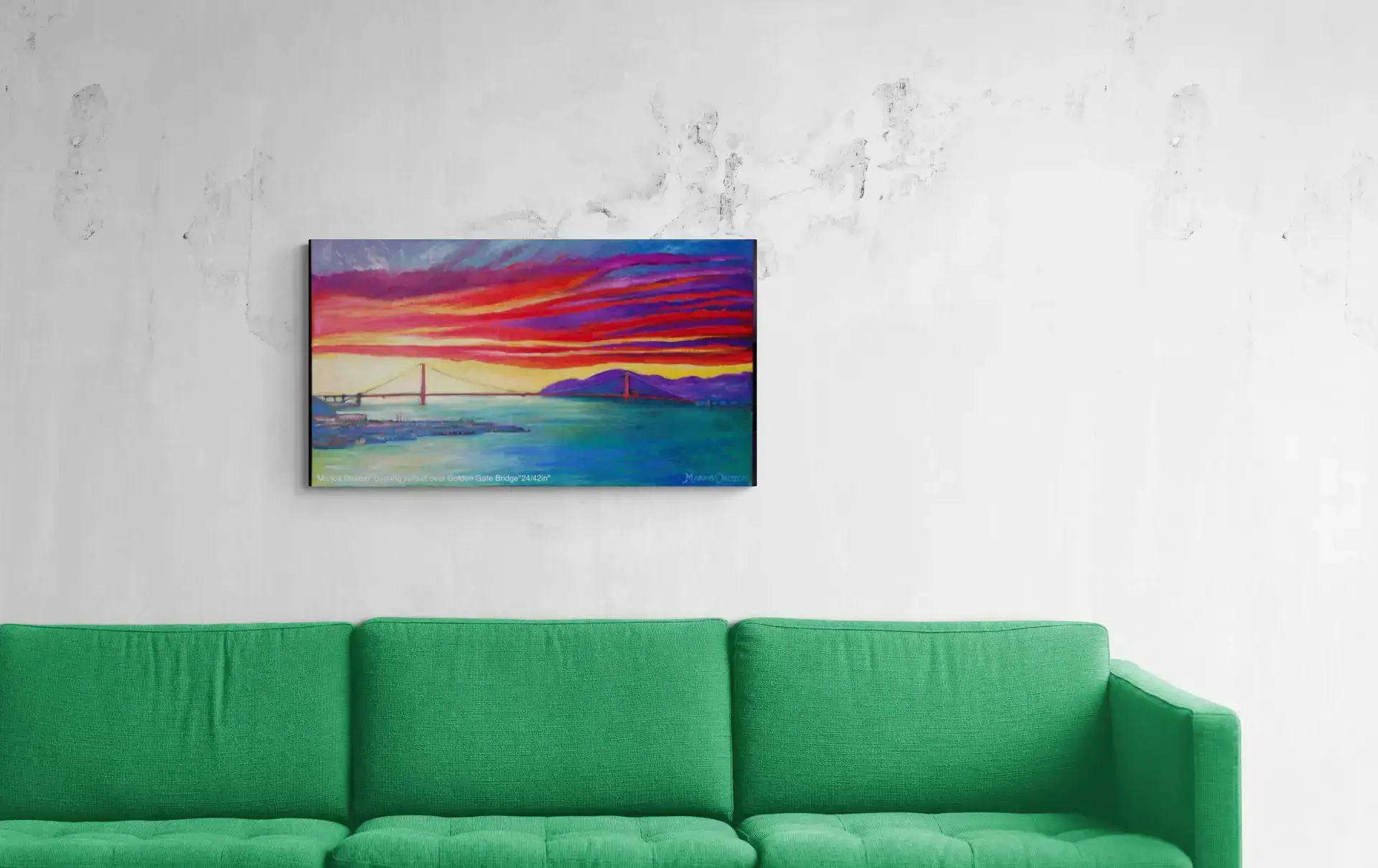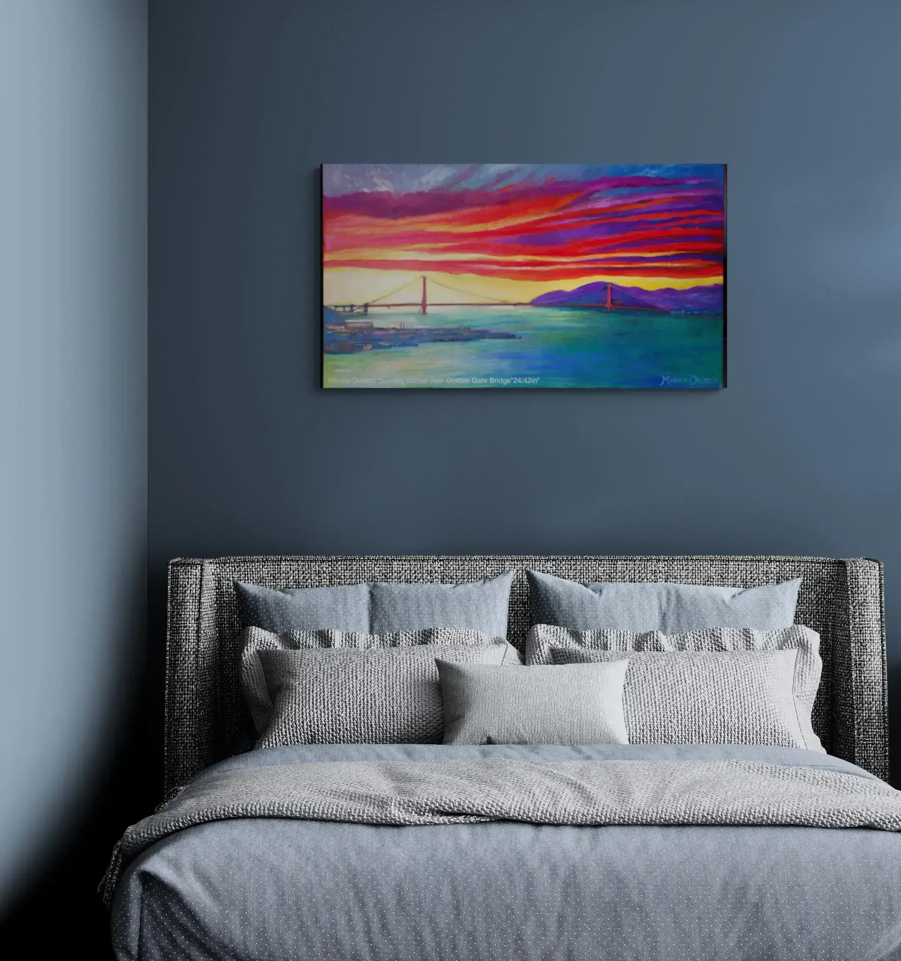 Here you can see the Golden Gate Bridge from another view though, as the sun is setting creating bright reds and yellows that inspired him to paint this beautiful piece of artwork.