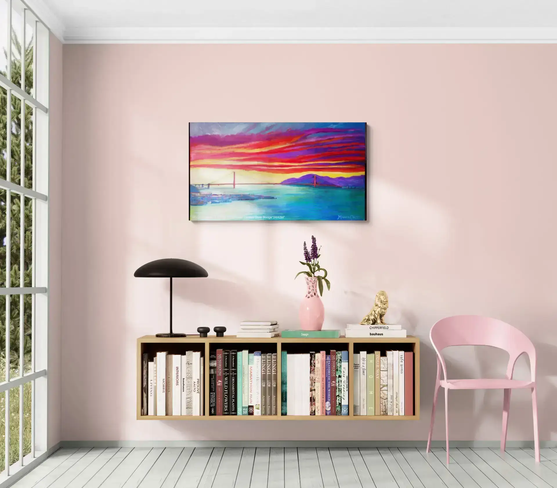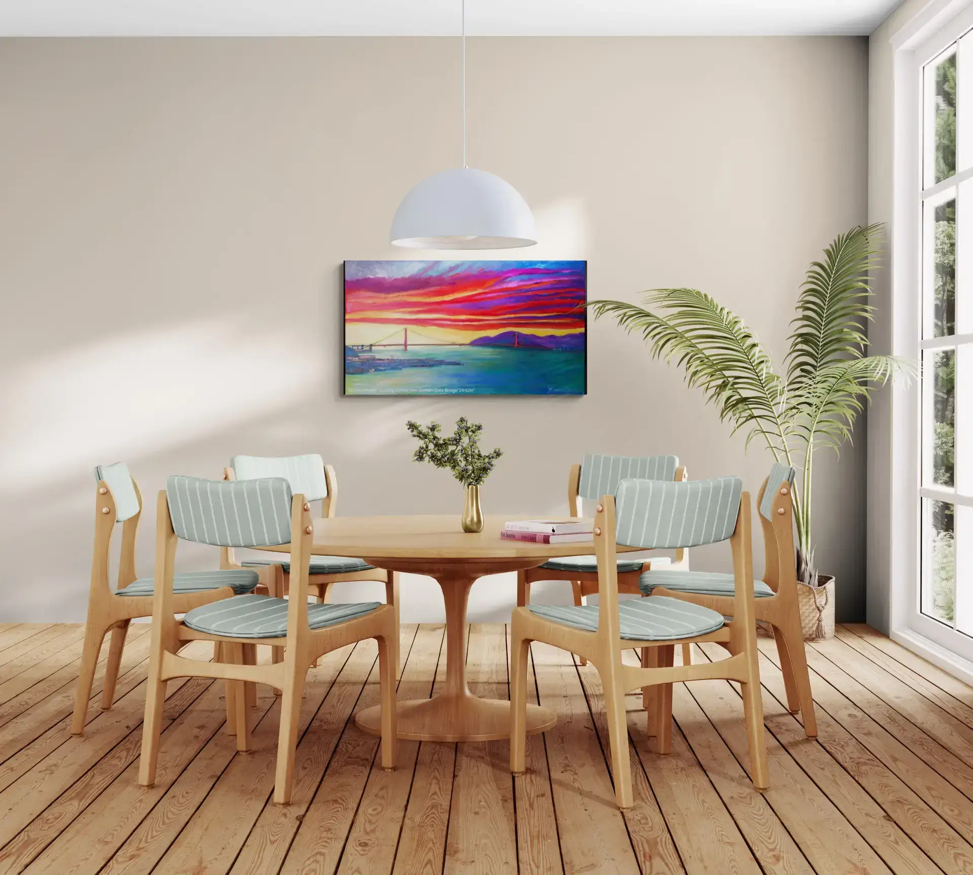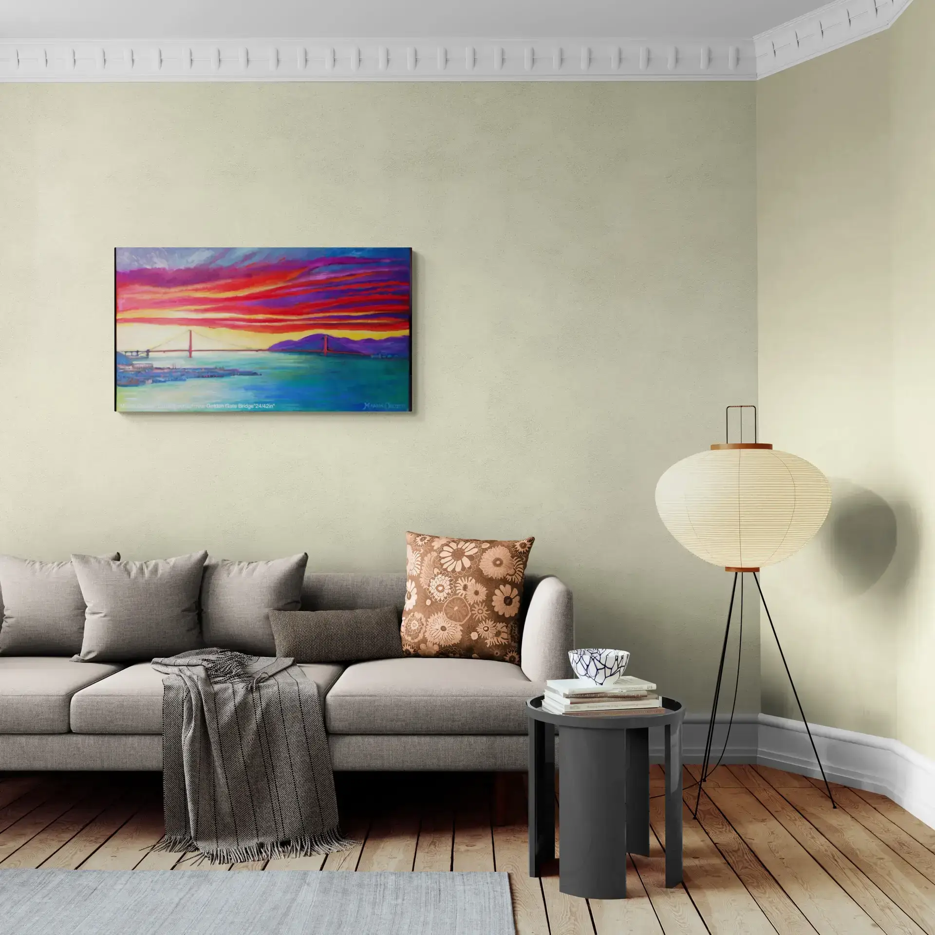 Here you can see the Golden Gate Bridge from another view though, as the sun is setting creating bright reds and yellows that inspired him to paint this beautiful piece of artwork.