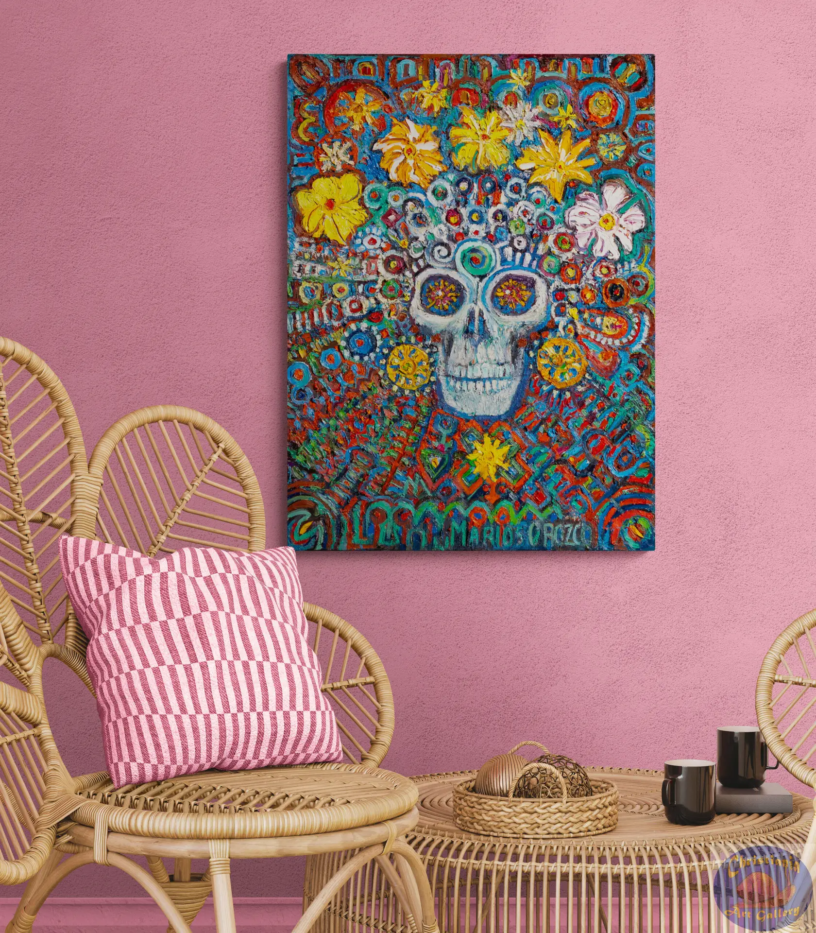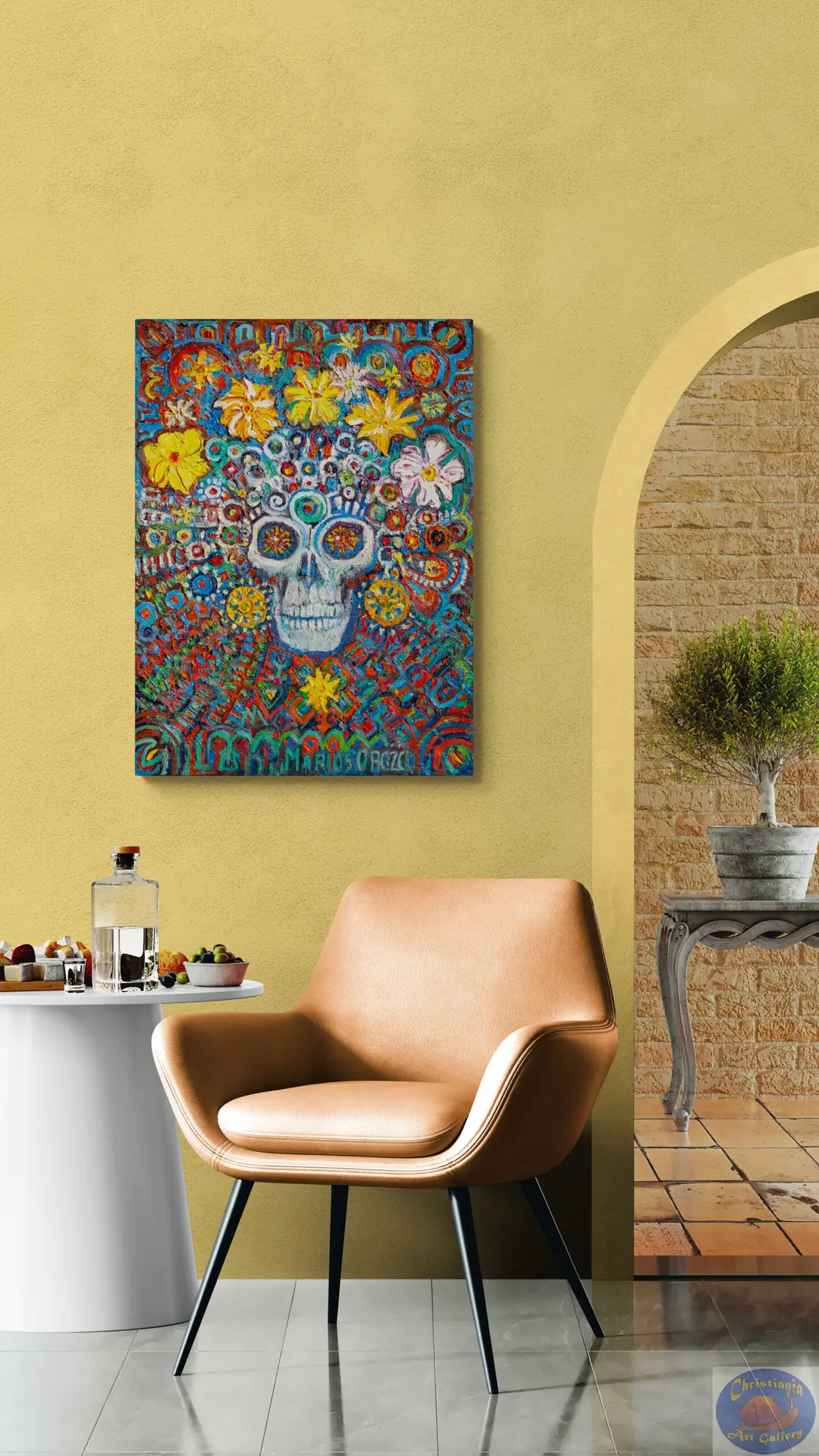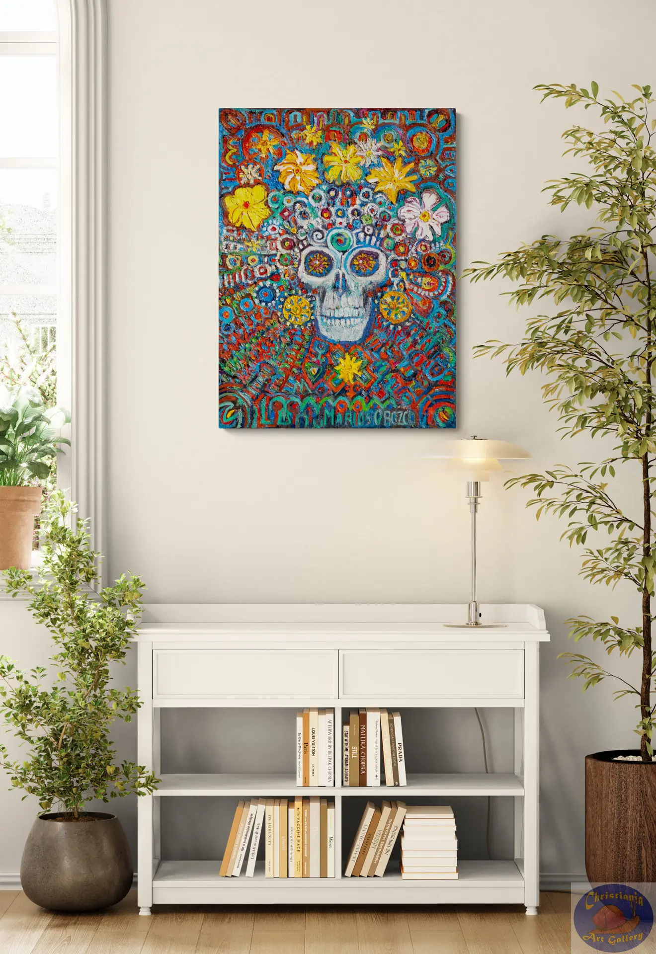 Bold, expressive, and deeply symbolic, Calavera for My Father is a vibrant tribute to memory, heritage, and the enduring bond between Marios and his father.