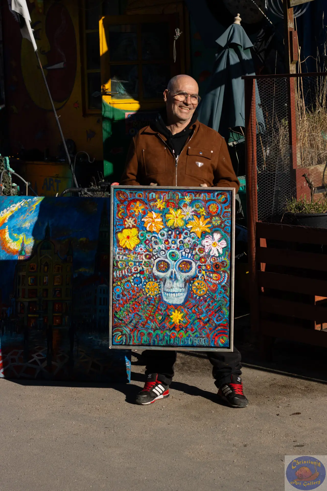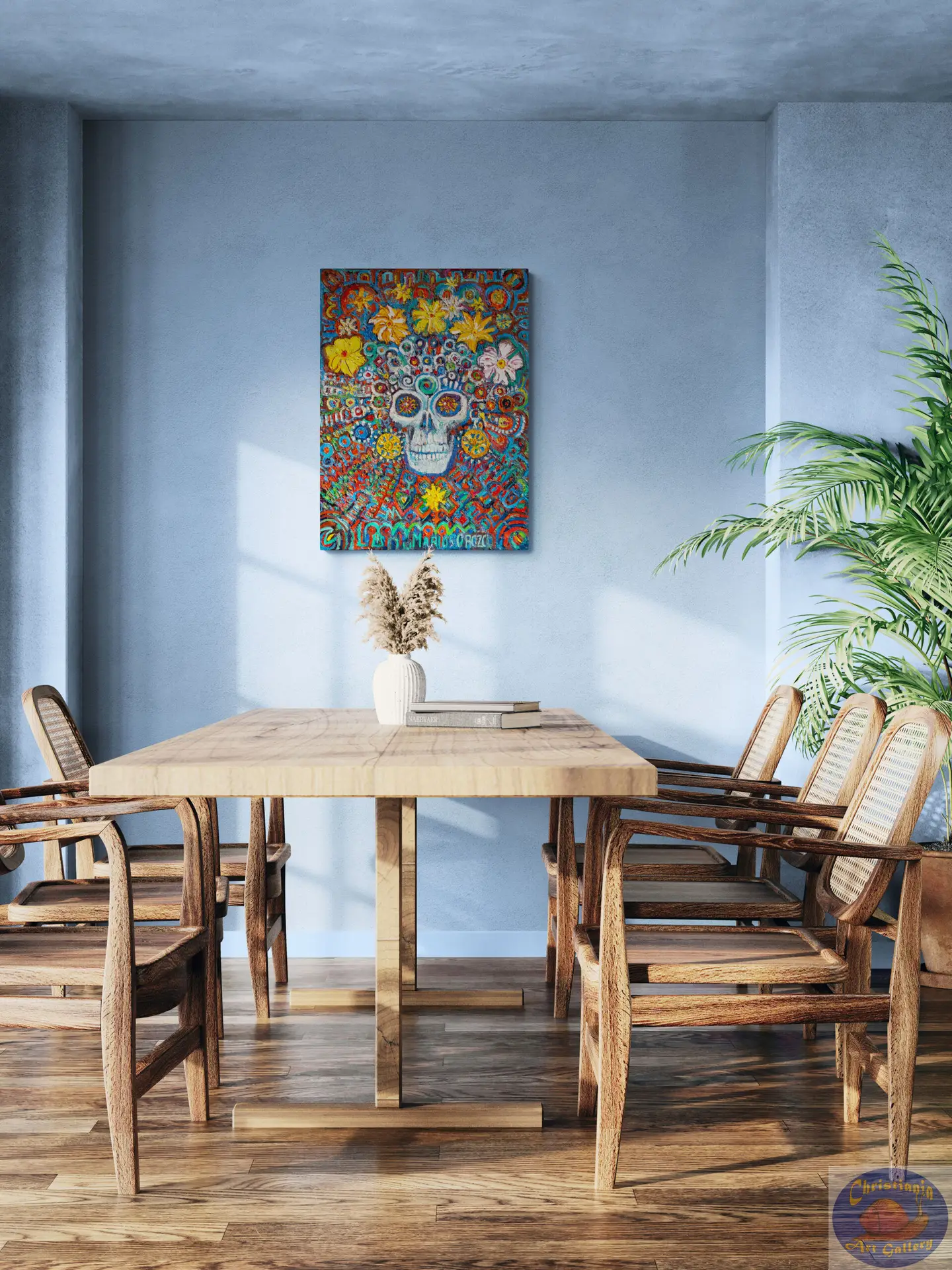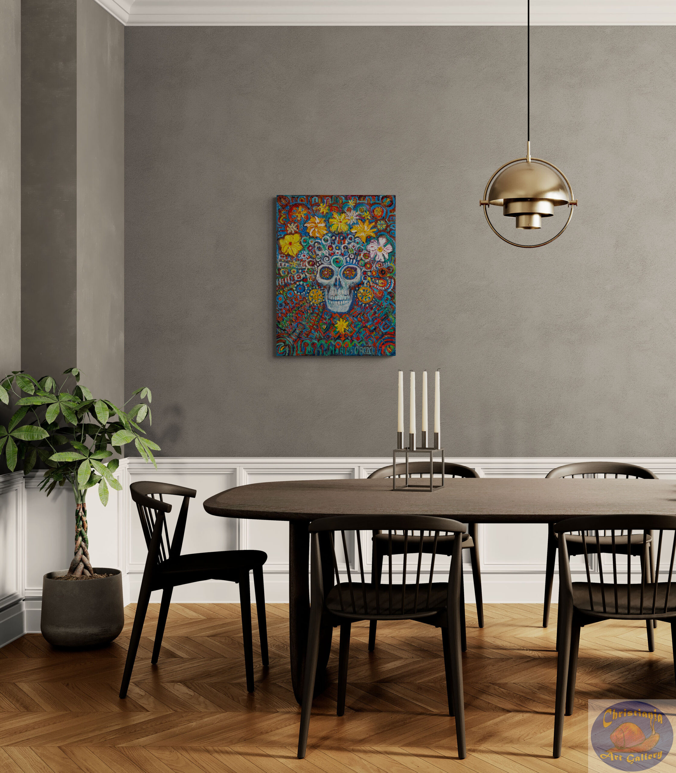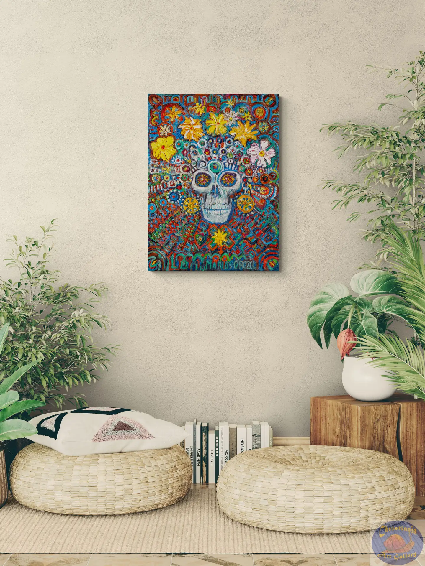 Bold, expressive, and deeply symbolic, Calavera for My Father is a vibrant tribute to memory, heritage, and the enduring bond between Marios and his father.