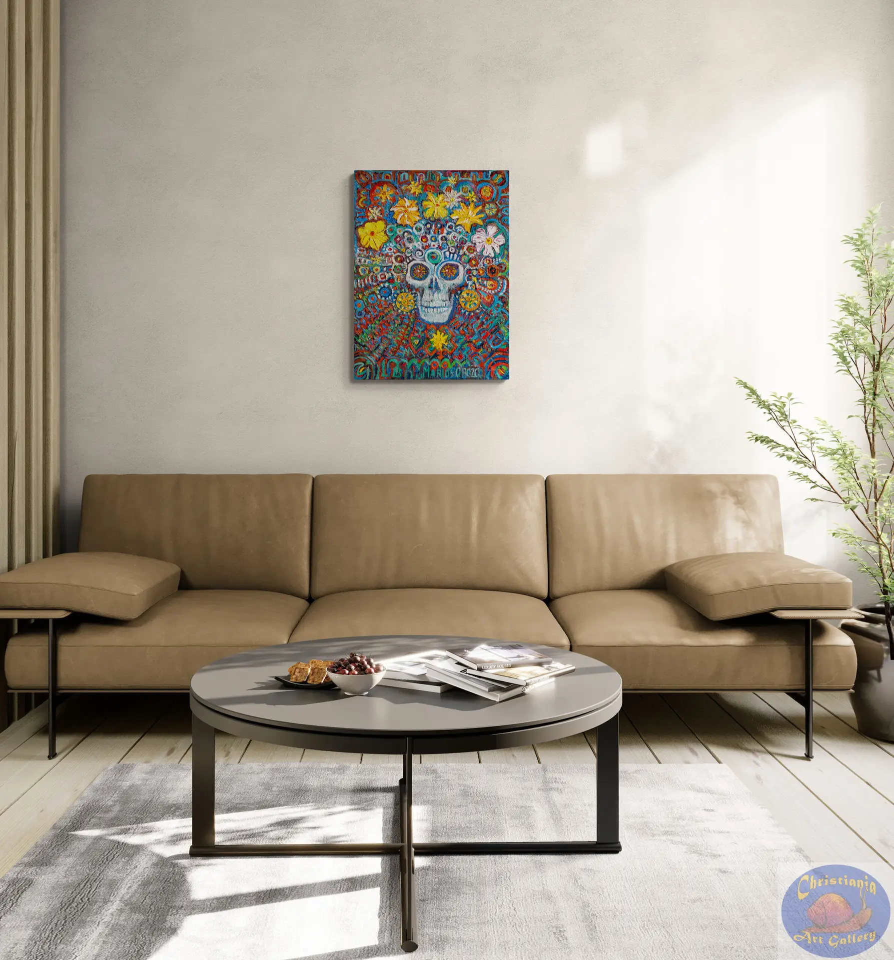 Intricate patterns and vivid colors dance across the surface, blending traditional motifs with a contemporary artistic touch. Floral elements, ornamental details, and layered textures bring the skull to life, transforming it into a powerful symbol of both fragility and celebration. Each brushstroke feels intentional—honoring the past while embracing the beauty of remembrance.