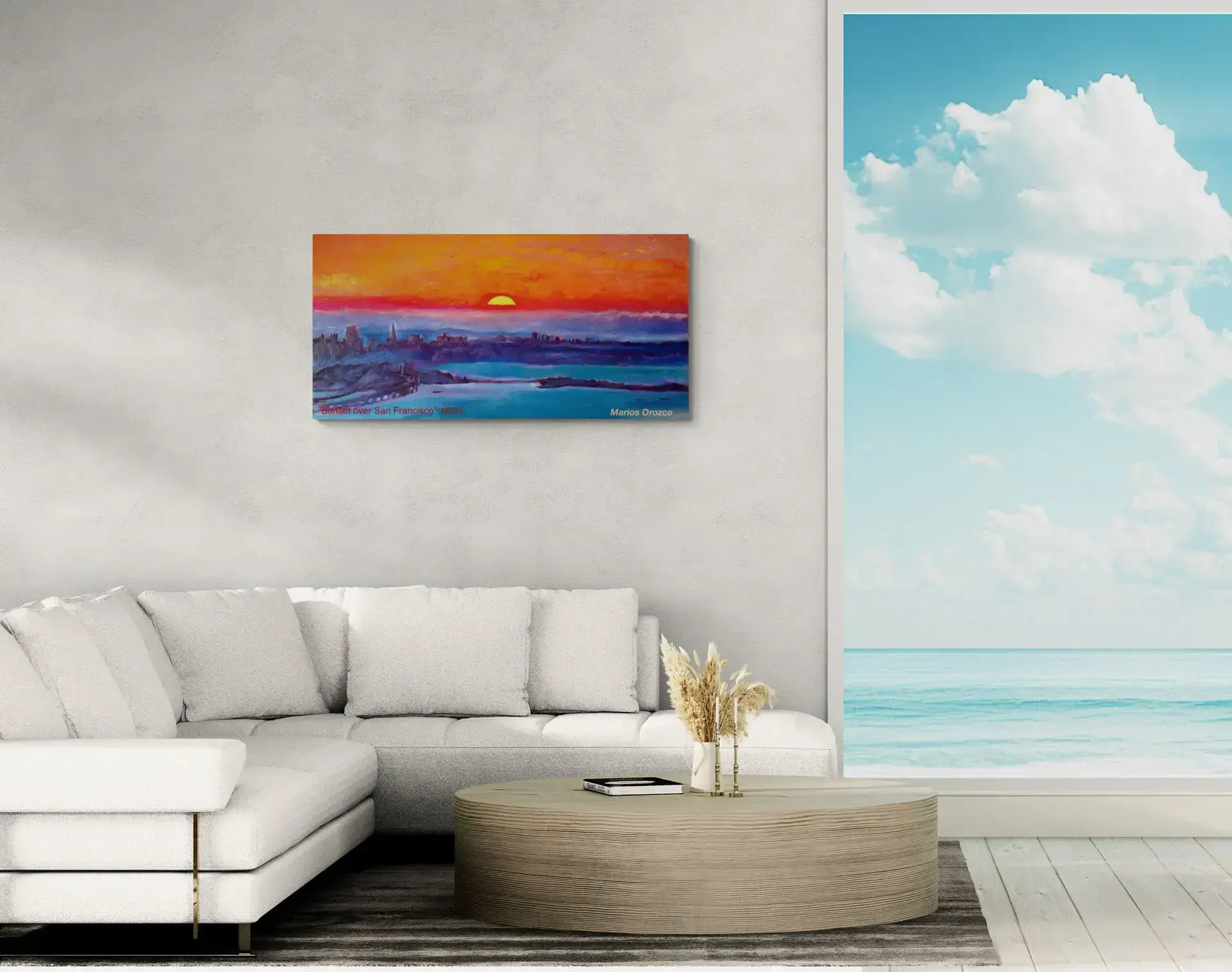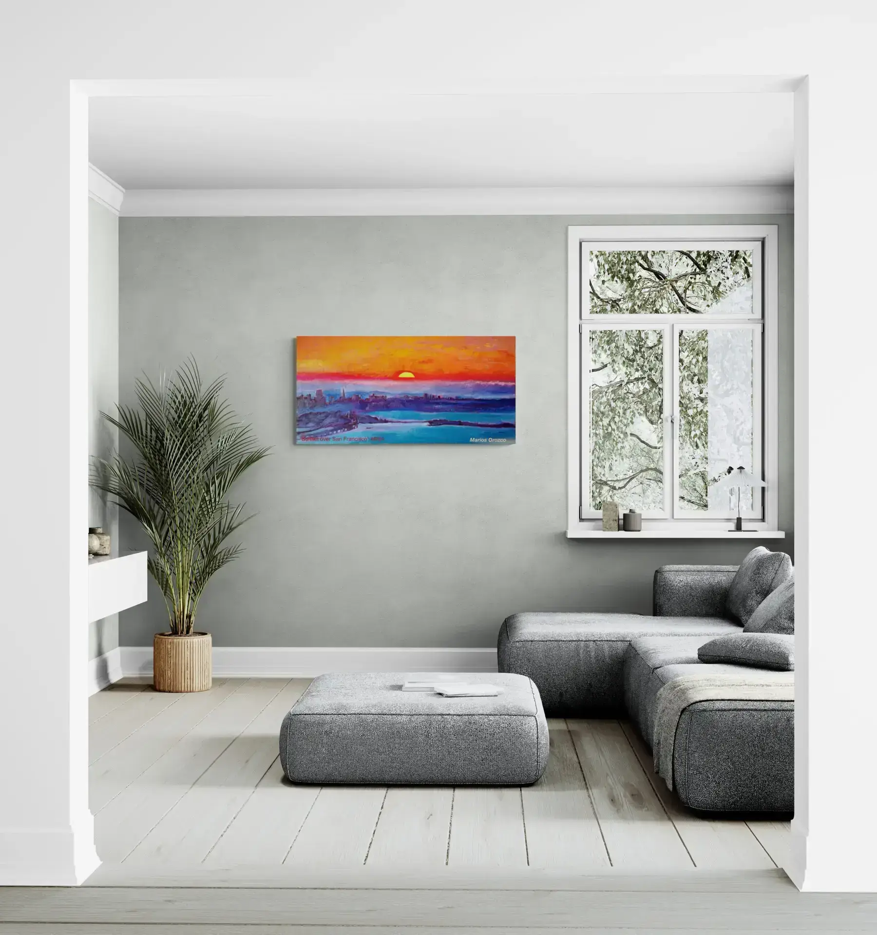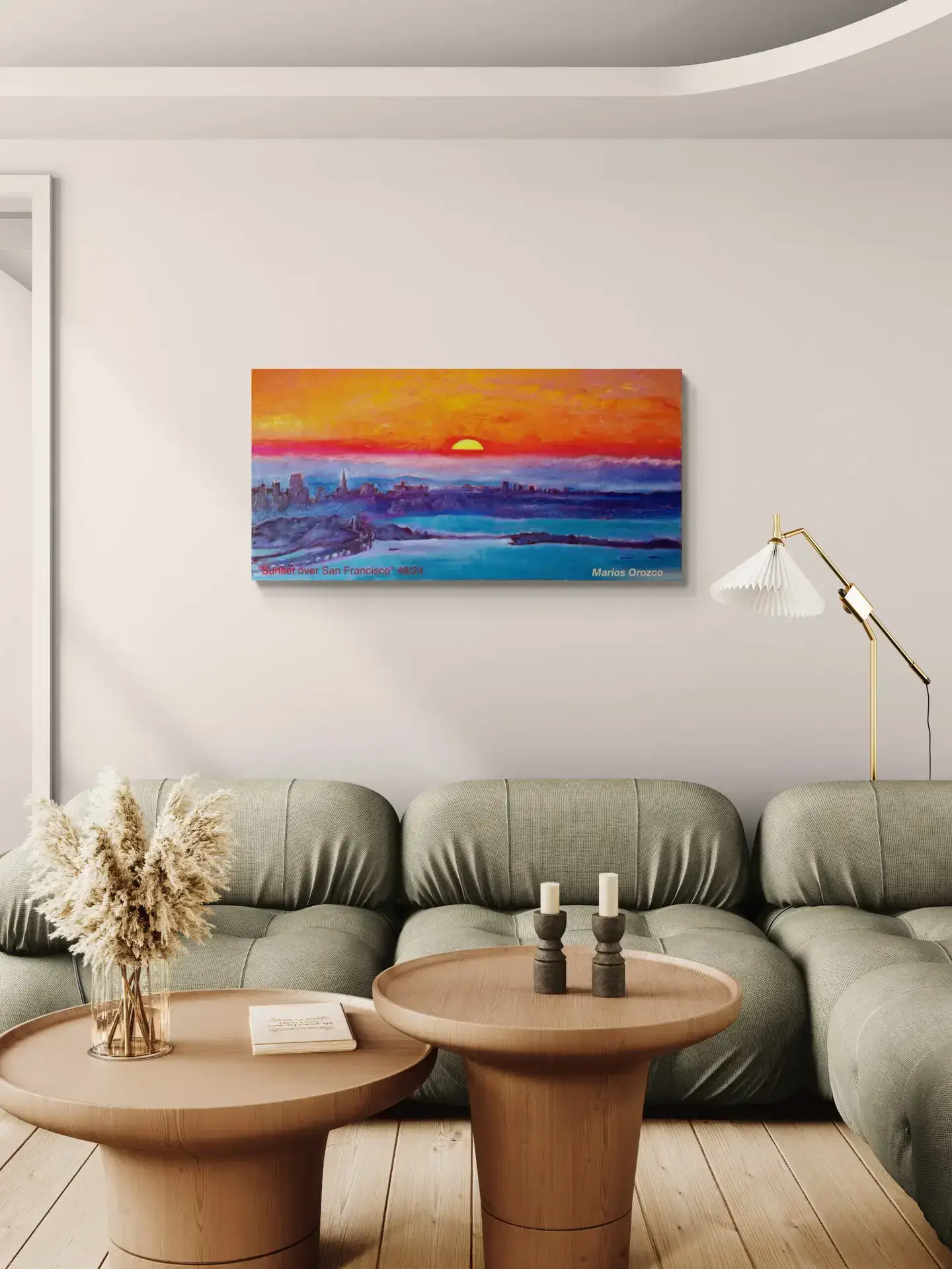Marios lived part time in San Francisco from 2012-2016. This painting is from his time there. This is a beautiful warm impression of a sunset over San Franscisco. The warm orange, red and yellow warms up the cold blues and turns them into glowing purples. This energizing but serene oil painting can give light and life in any room you add the painting.