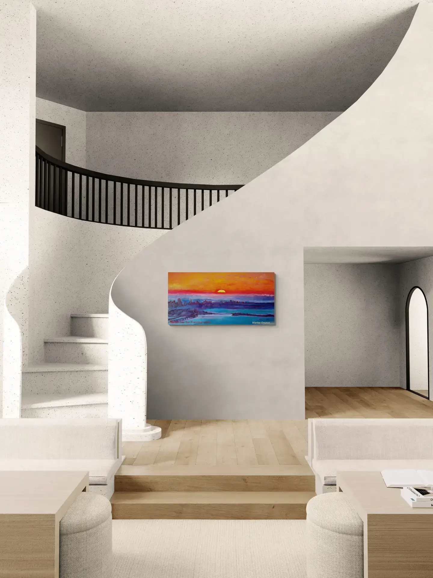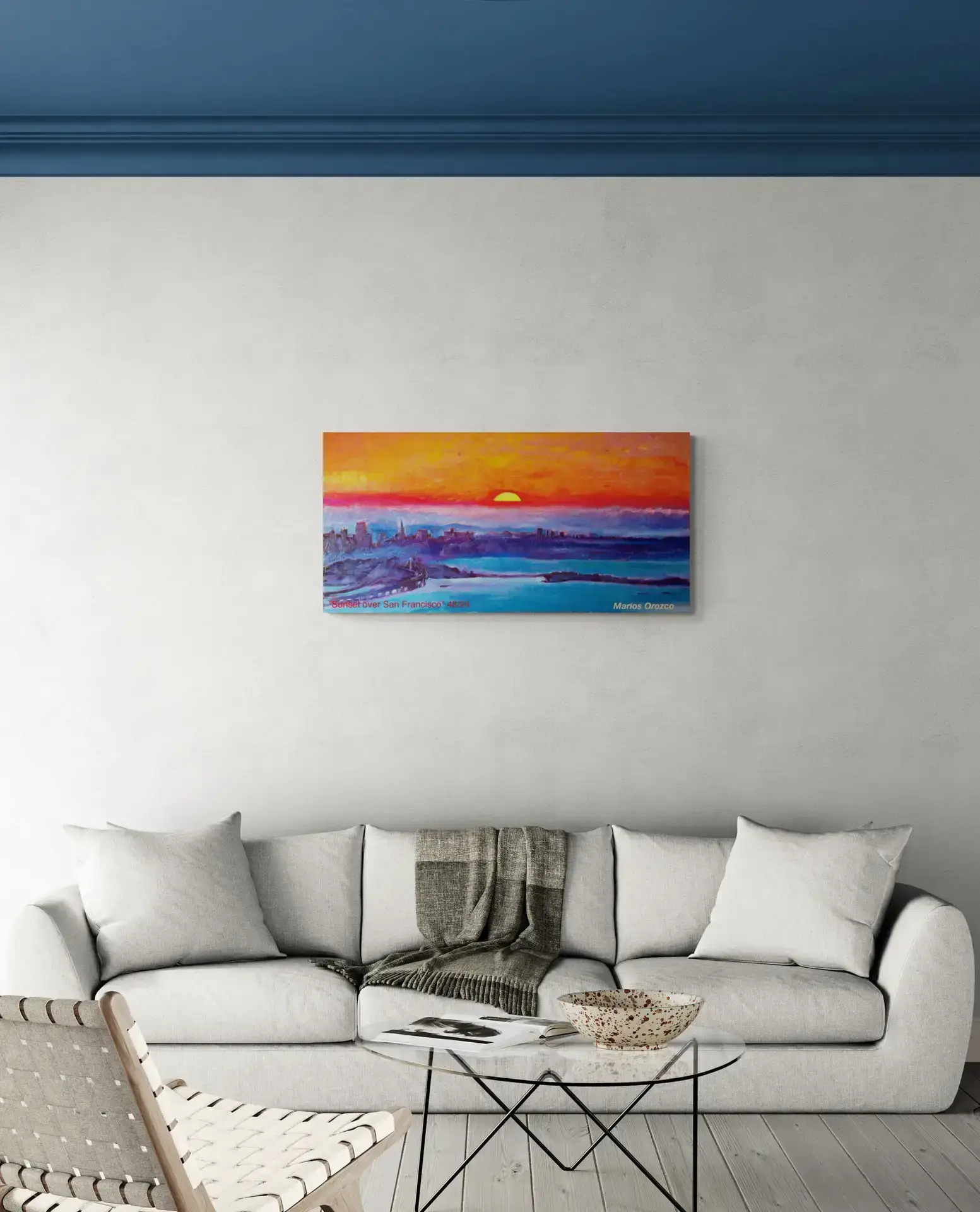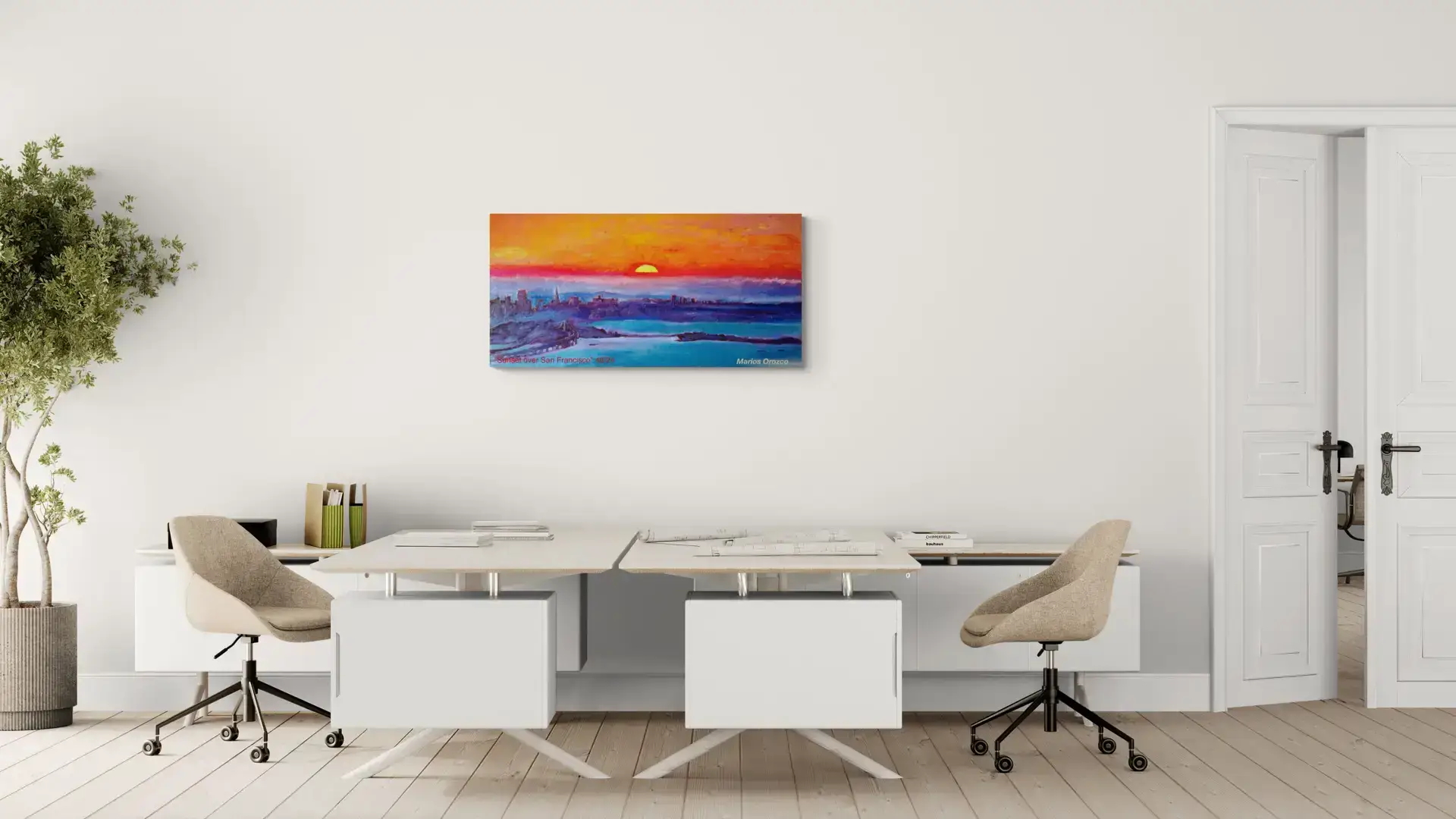 Marios lived part time in San Francisco from 2012-2016. This painting is from his time there. This is a beautiful warm impression of a sunset over San Franscisco. The warm orange, red and yellow warms up the cold blues and turns them into glowing purples. This energizing but serene oil painting can give light and life in any room you add the painting.