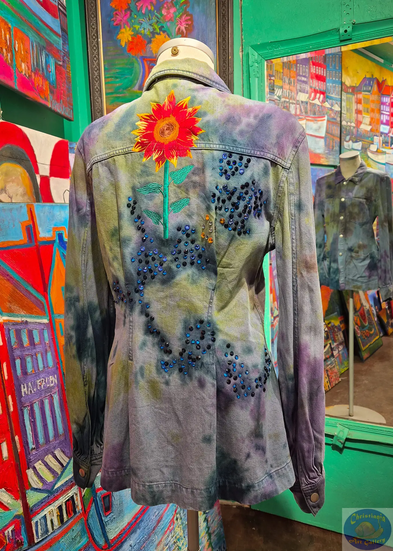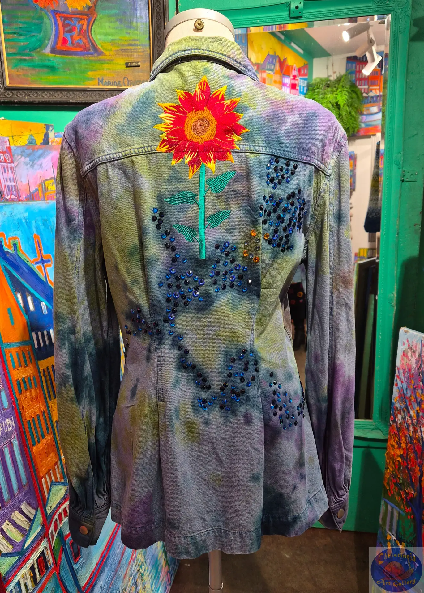 The back features a bold red sunflower in full bloom, embroidered with vibrant yellow, red, and green threads that lift the flower off the surface. Surrounding it, hand-applied embellishments shimmer organically across the jacket, echoing movement, light, and growth. The softly washed tie-dye base blends muted greens, blues, and purples, creating a painterly backdrop that feels both grounded and ethereal.
