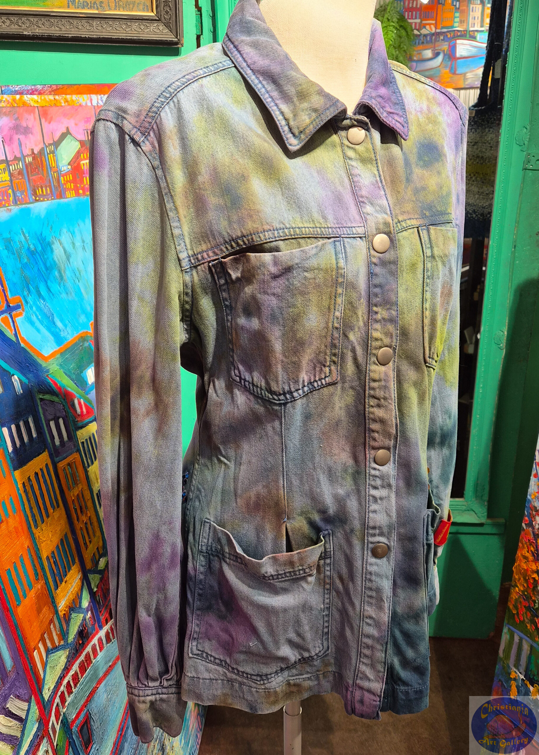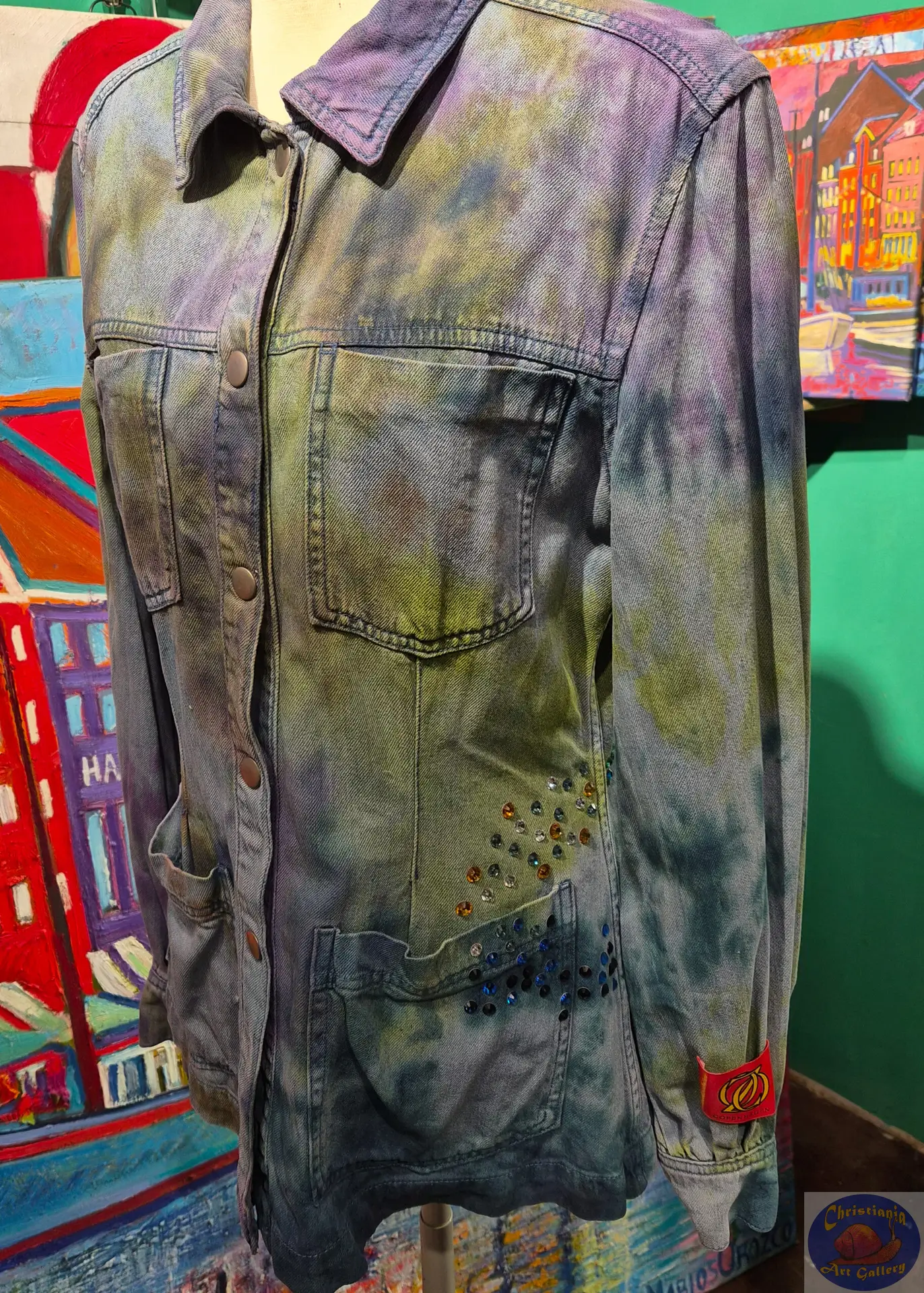A radiant expression of color, texture, and transformation, The Red Sunflower Jacket by Stephanie Orozco, is a true one-of-a-kind wearable artwork. Built on a fitted denim shirt, this piece has been hand tie-dyed, embroidered, and delicately bedazzled—each step adding depth and individuality.