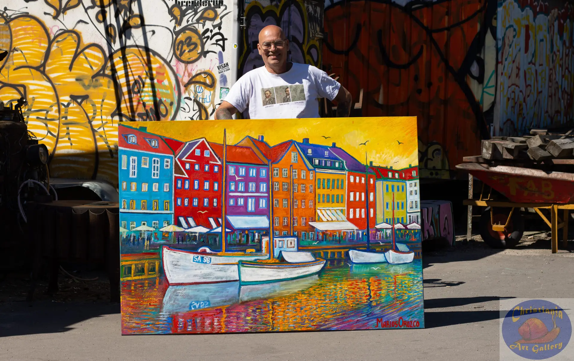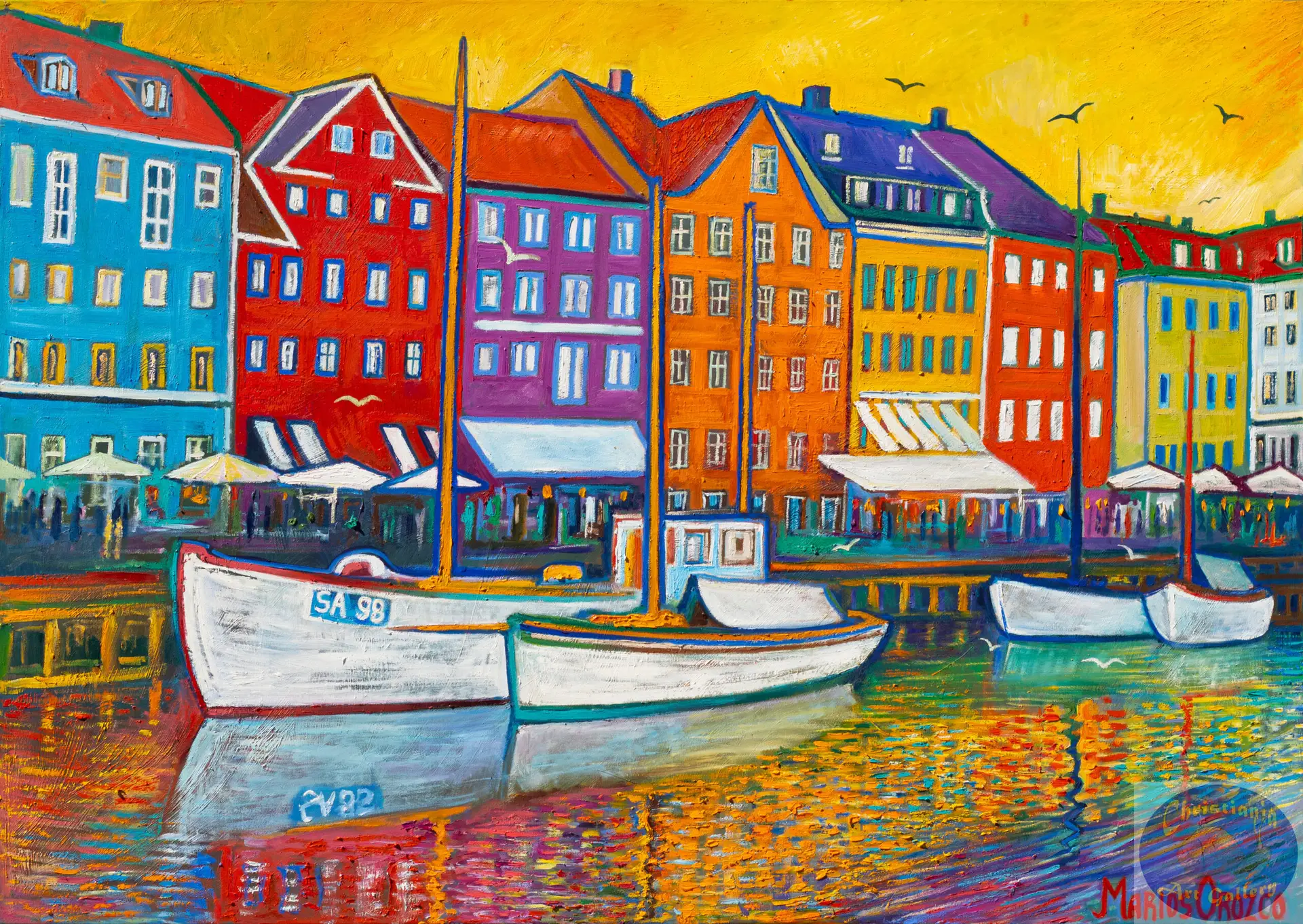 Step into a radiant dusk over Copenhagen’s cherished harbor with Yellow Sky Over Nyhavn. In this sweeping original oil painting, Marios Orozco captures the city’s iconic waterfront — bathed in the golden glow of a setting sky — with commanding scale and emotion.